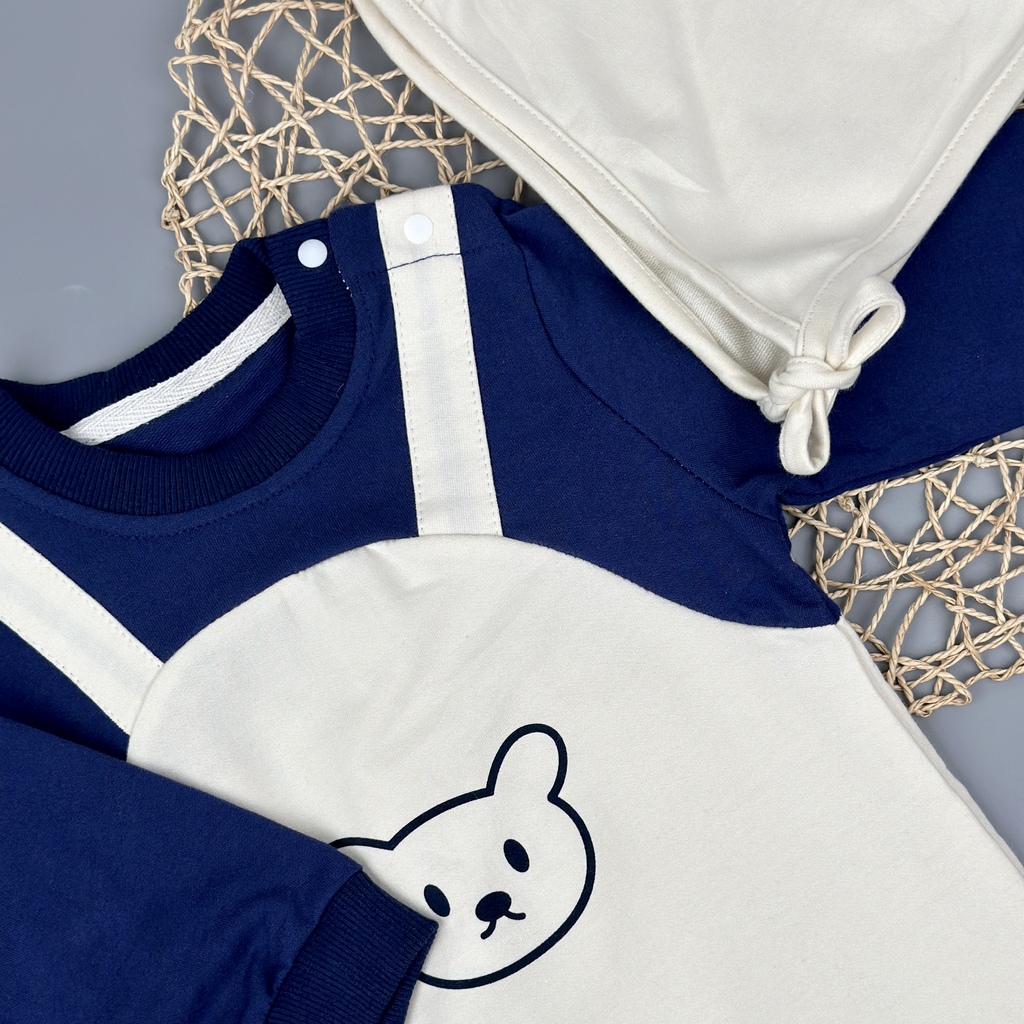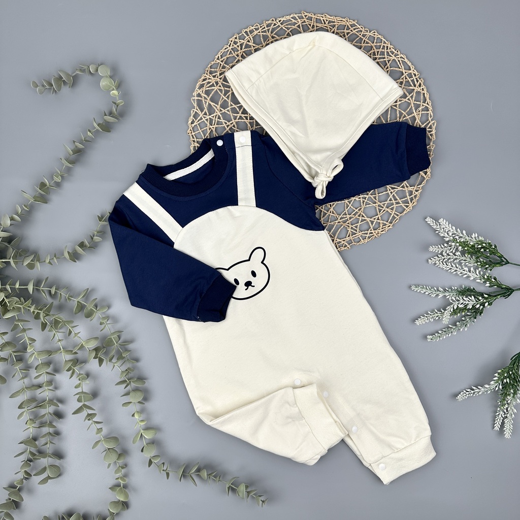 MAMELUCO BEIGE/AZUL CON APLIQUE CARITA DE OSO CON GORRITO BEIGE