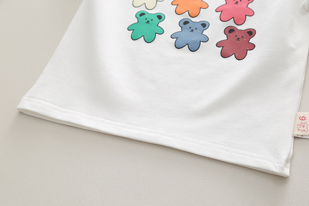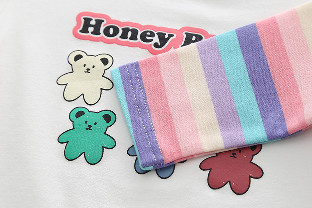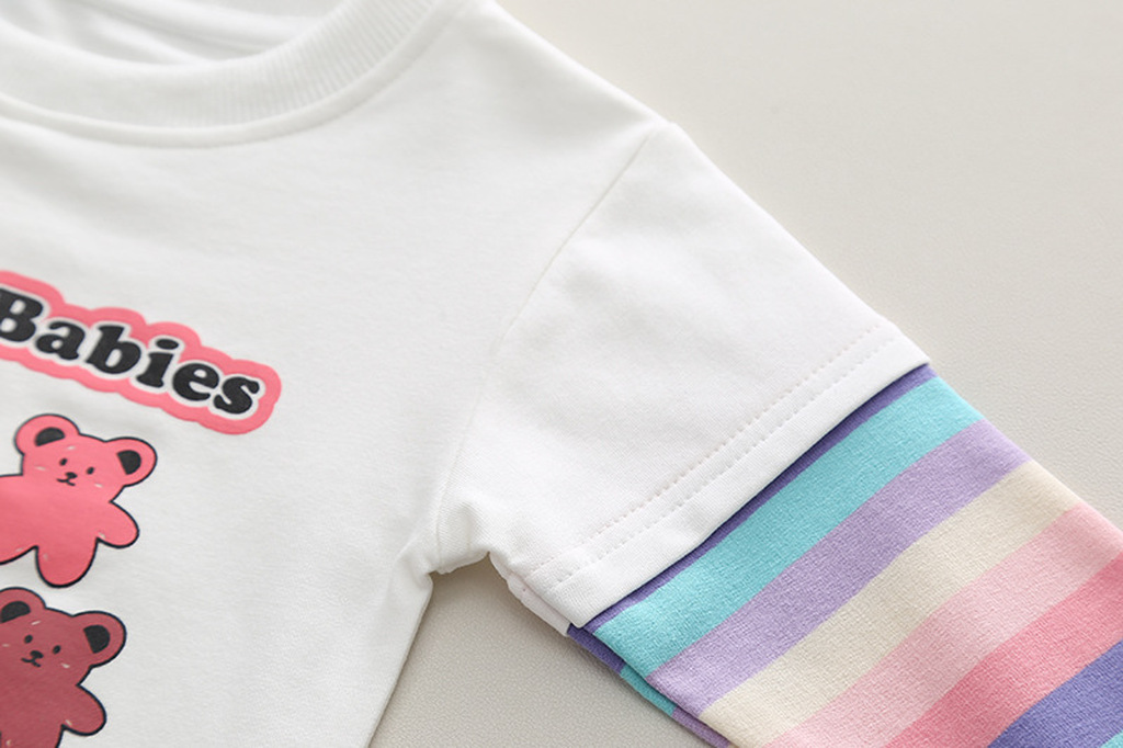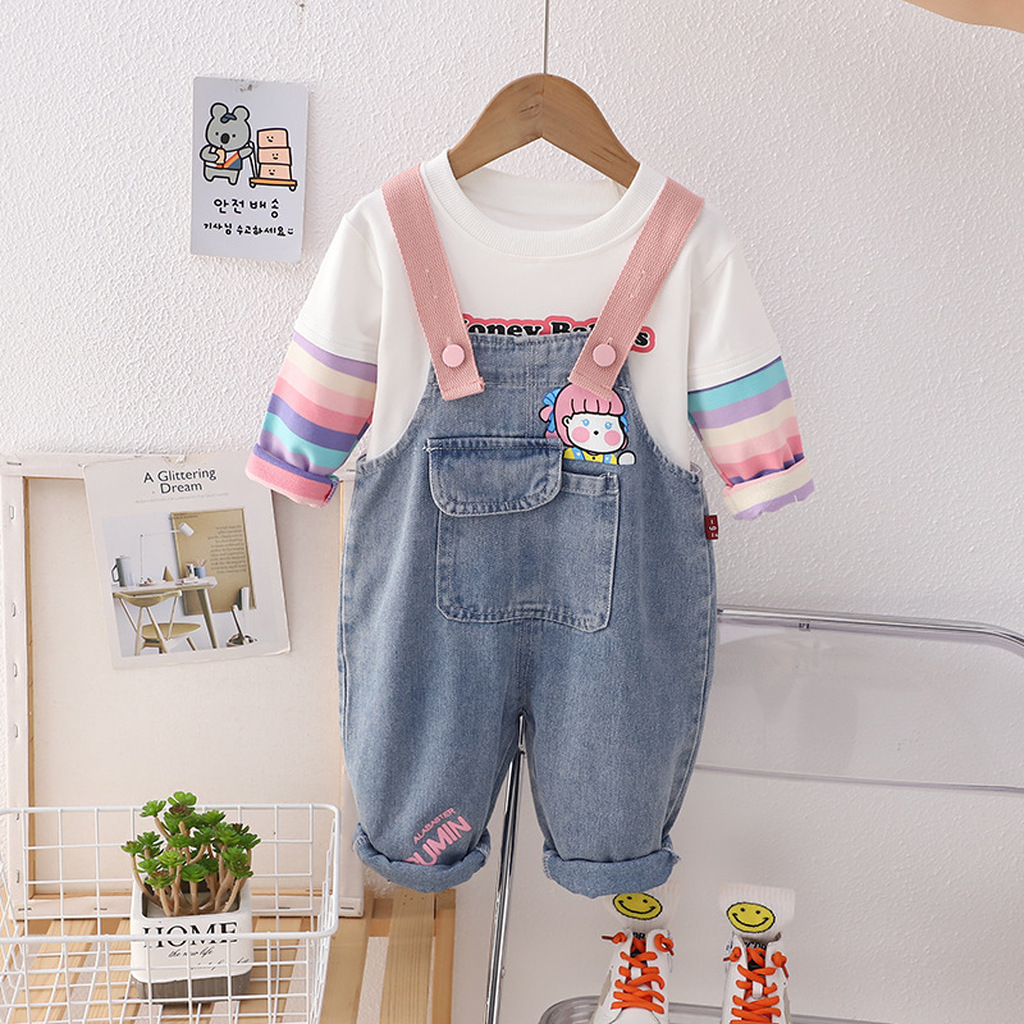 SETX2 CAMIBUSO BLANCO CON MANGAS ARCO IRIS Y ESTAMPADOS OVEROL EN JEAN CON APLIQUE LETRAS Y ALITAS 3D EN ESPALDA